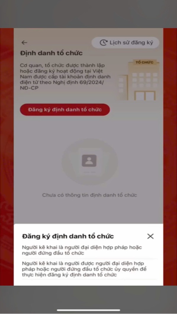 Bước 1: Người đại diện theo pháp luật, người đứng đầu cơ quan, tổ chức, hoặc người được người đại diện theo pháp luật, người đứng đầu ủy quyền thực hiện đăng nhập tài khoản định danh điện tử mức 2 trên ứng dụng VNeID => Chọn Định danh tổ chức.